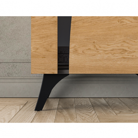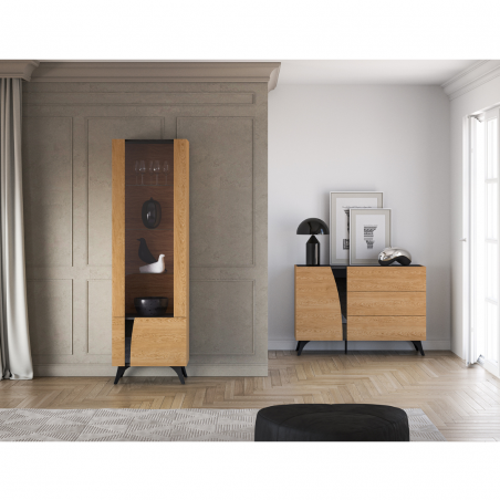 Toscania to kolekcja eleganckich mebli do pokoju dziennego. Bryły stworzone są z doskonale komponujących się wzorów płyt – wyraźnego, dębowego usłojenia Baltic Dune oraz kontrastującego, czarnego Jesionu Portland. Klasyczne usłojenie drewna przełamane jest czarną, szklaną wstawką w połysku. Oryginalnie zaokrąglone fronty oraz niebanalnie wyprofilowane nóżki nadają bryłom odpowiedni rytm, dodający wnętrzu dynamiki i charakteru. Szeroka gama brył pozwoli zaaranżować zarówno mały apartament w centrum miasta jak i salon w dużym domu na przedmieściach.
