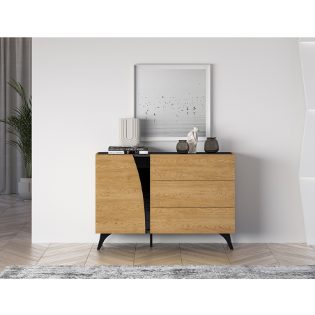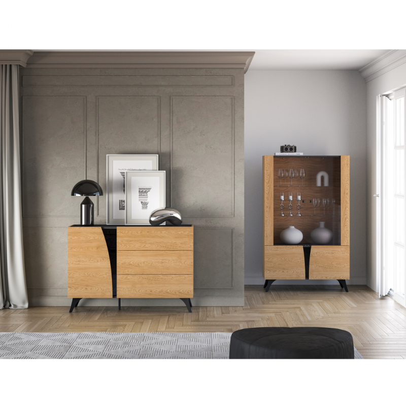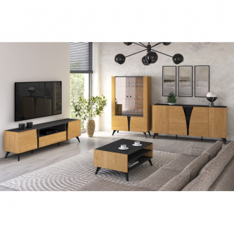 Toscania to kolekcja eleganckich mebli do pokoju dziennego. Bryły stworzone są z doskonale komponujących się wzorów płyt – wyraźnego, dębowego usłojenia Baltic Dune oraz kontrastującego, czarnego Jesionu Portland. Klasyczne usłojenie drewna przełamane jest czarną, szklaną wstawką w połysku. Oryginalnie zaokrąglone fronty oraz niebanalnie wyprofilowane nóżki nadają bryłom odpowiedni rytm, dodający wnętrzu dynamiki i charakteru. Szeroka gama brył pozwoli zaaranżować zarówno mały apartament w centrum miasta jak i salon w dużym domu na przedmieściach.