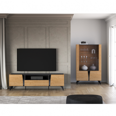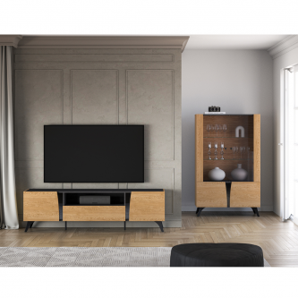 Toscania to kolekcja eleganckich mebli do pokoju dziennego. Bryły stworzone są z doskonale komponujących się wzorów płyt – wyraźnego, dębowego usłojenia Baltic Dune oraz kontrastującego, czarnego Jesionu Portland. Klasyczne usłojenie drewna przełamane jest czarną, szklaną wstawką w połysku. Oryginalnie zaokrąglone fronty oraz niebanalnie wyprofilowane nóżki nadają bryłom odpowiedni rytm, dodający wnętrzu dynamiki i charakteru. Szeroka gama brył pozwoli zaaranżować zarówno mały apartament w centrum miasta jak i salon w dużym domu na przedmieściach.