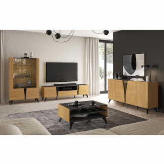 Toscania to kolekcja eleganckich mebli do pokoju dziennego. Bryły stworzone są z doskonale komponujących się wzorów płyt – wyraźnego, dębowego usłojenia Baltic Dune oraz kontrastującego, czarnego Jesionu Portland. Klasyczne usłojenie drewna przełamane jest czarną, szklaną wstawką w połysku. Oryginalnie zaokrąglone fronty oraz niebanalnie wyprofilowane nóżki nadają bryłom odpowiedni rytm, dodający wnętrzu dynamiki i charakteru. Szeroka gama brył pozwoli zaaranżować zarówno mały apartament w centrum miasta jak i salon w dużym domu na przedmieściach.