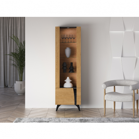 Toscania to kolekcja eleganckich mebli do pokoju dziennego. Bryły stworzone są z doskonale komponujących się wzorów płyt – wyraźnego, dębowego usłojenia Baltic Dune oraz kontrastującego, czarnego Jesionu Portland. Klasyczne usłojenie drewna przełamane jest czarną, szklaną wstawką w połysku. Oryginalnie zaokrąglone fronty oraz niebanalnie wyprofilowane nóżki nadają bryłom odpowiedni rytm, dodający wnętrzu dynamiki i charakteru. Szeroka gama brył pozwoli zaaranżować zarówno mały apartament w centrum miasta jak i salon w dużym domu na przedmieściach.