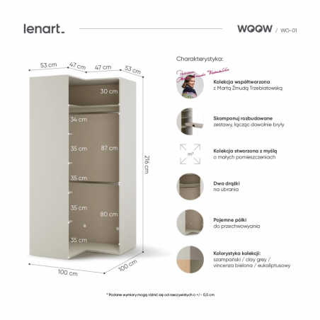 Wąski pokój w kamienicy? Niewielka przestrzeń w bloku, gdzie każdy centymetr się liczy? WOOW radzi sobie z niemal z każdym wyzwaniem architektonicznym. Nasze meble są jak klocki – możecie je układać wzdłuż ściany, w narożniku, a nawet tworzyć z nich funkcjonalne przegrody w większych pomieszczeniach.