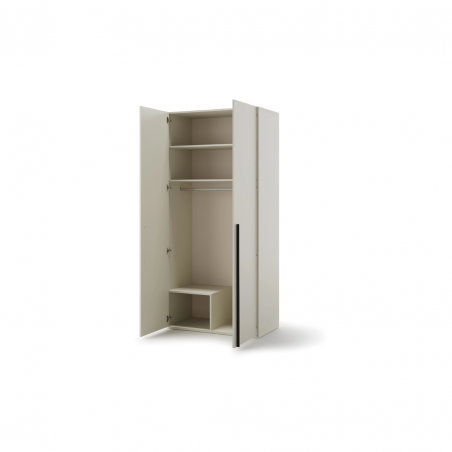 - Przemyślane wnętrze – półki, drążek i dolne wnęki pozwalają na uporządkowane przechowywanie ubrań, akcesoriów i butów.