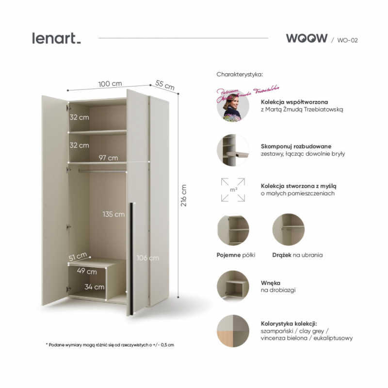Wnętrze szafy zostało zaprojektowane z myślą o maksymalnej wygodzie i funkcjonalności: