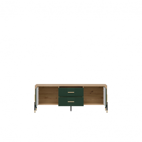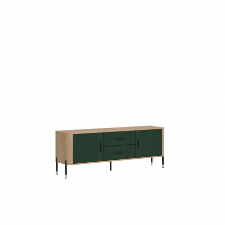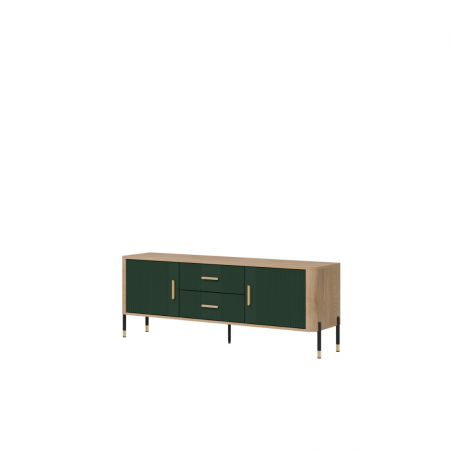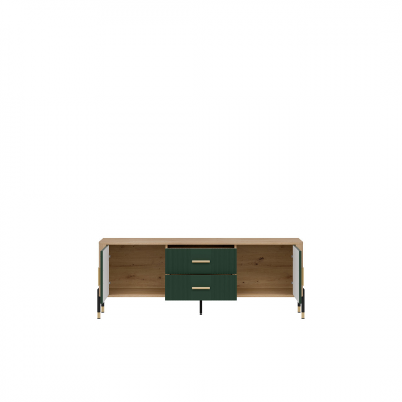 Cechy produktu: 4 pojemne szafki i 2 funkcjonalne szuflady – idealne na dokumenty, tekstylia czy zastawę, ryflowane fronty z pionowym wzorem – designerski akcent, który przyciąga wzrok, solidna konstrukcja na metalowych nogach ze złotym wykończeniem – stabilność i styl w jednym, ergonomiczne, złote uchwyty – komfort użytkowania i luksusowy wygląd.