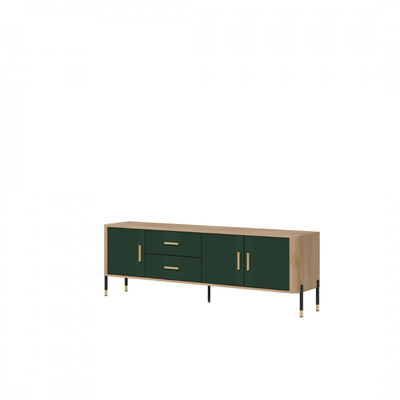 Szafka RTV Dante DT02 – Nowoczesna forma, ponadczasowy styl. Zachwyć się elegancją i funkcjonalnością szafki RTV DT02, która doskonale łączy prostotę formy z wyrafinowanymi detalami. Jej wydłużona konstrukcja sprawia, że idealnie sprawdzi się jako stylowy mebel pod telewizor. Połączenie ryflowanych frontów dostępnych w pięciu wariantach kolorystycznych z drewnopodobnym korpusem w odcieniu naturalnego dębu tworzy estetykę nowoczesnego luksusu. Całość dopełniają złote lub czarne uchwyty i subtelne wykończenia nóg, które nadają meblowi elegancki charakter. Cechy wyróżniające: Cztery drzwiowe szafki i dwie centralne szuflady – doskonałe na przechowywanie, ryflowane fronty – designerski detal podkreślający charakter mebla, stabilne, metalowe nogi z ozdobnymi złotymi końcówkami, stylowe uchwyty w kolorze złotym lub czarnym – akcent klasy premium. Idealna do: Nowoczesnych i industrialnych wnętrz, Salonu jako szafka RTV. Szafka RTV Dante DT02 to nie tylko mebel – to ozdoba wnętrza, która łączy nowoczesny design z codzienną praktycznością.