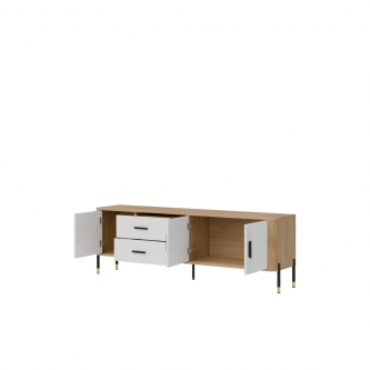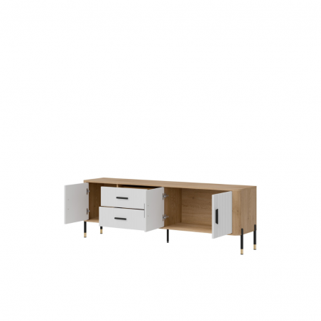 Szafka RTV Dante DT02 – Nowoczesna forma, ponadczasowy styl. Zachwyć się elegancją i funkcjonalnością szafki RTV DT02, która doskonale łączy prostotę formy z wyrafinowanymi detalami. Jej wydłużona konstrukcja sprawia, że idealnie sprawdzi się jako stylowy mebel pod telewizor. Połączenie ryflowanych frontów dostępnych w pięciu wariantach kolorystycznych z drewnopodobnym korpusem w odcieniu naturalnego dębu tworzy estetykę nowoczesnego luksusu. Całość dopełniają złote lub czarne uchwyty i subtelne wykończenia nóg, które nadają meblowi elegancki charakter. Cechy wyróżniające: Cztery drzwiowe szafki i dwie centralne szuflady – doskonałe na przechowywanie, ryflowane fronty – designerski detal podkreślający charakter mebla, stabilne, metalowe nogi z ozdobnymi złotymi końcówkami, stylowe uchwyty w kolorze złotym lub czarnym – akcent klasy premium. Idealna do: Nowoczesnych i industrialnych wnętrz, Salonu jako szafka RTV. Szafka RTV Dante DT02 to nie tylko mebel – to ozdoba wnętrza, która łączy nowoczesny design z codzienną praktycznością.