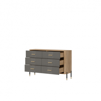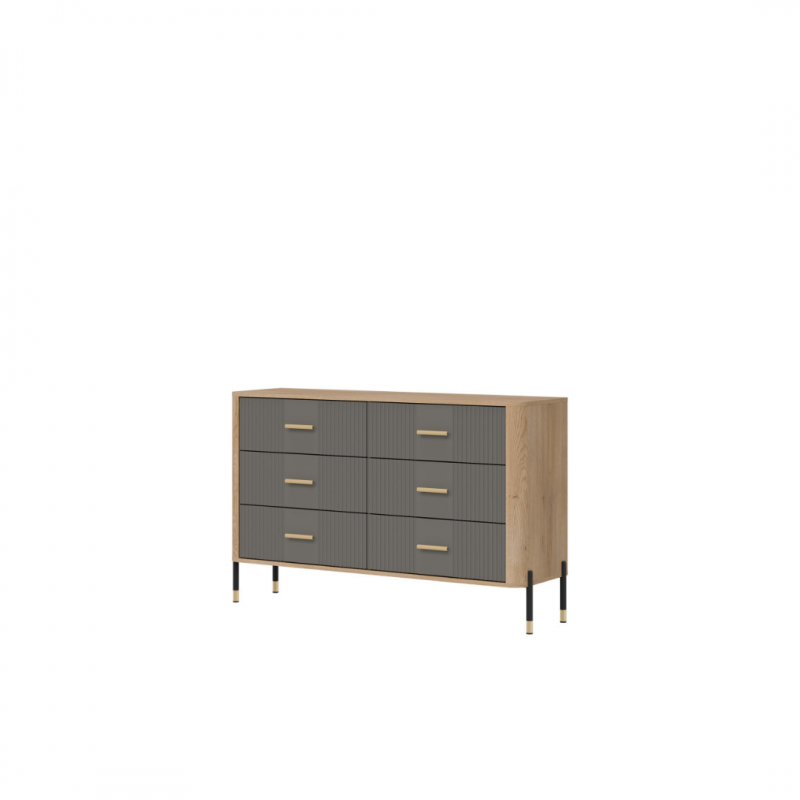 Komoda Dante DT04 to nowoczesna symetria i elegancja w funkcjonalnej formie. Wprowadź do swojego wnętrza nową jakość dzięki komodzie Dante DT04 – meblowi, który łączy nowoczesny styl z maksymalną praktycznością. Ten designerski model to propozycja dla osób ceniących wyważone proporcje, wysoką jakość wykonania i ponadczasowy wygląd. Matowe fronty do w wyboru w pięciu wariantach kolorystycznych, sześciu równomiernie rozmieszczonych szufladach tworzą elegancki rytm wizualny, podkreślony przez złote lub czarne uchwyty do wyboru i delikatne wykończenia. Korpus w kolorze naturalnego drewna dodaje meblowi ciepła i kontrastu, tworząc unikalną kompozycję, która pasuje zarówno do wnętrz loftowych, jak i skandynawskich czy nowoczesnych. Sześć przestronnych szuflad zapewnia imponującą ilość miejsca do przechowywania – idealne rozwiązanie do sypialni, salonu, garderoby czy nawet nowoczesnego biura. Dzięki starannie zaprojektowanej konstrukcji, każda szuflada pracuje płynnie i cicho, gwarantując wygodę codziennego użytkowania. Kompaktowa forma komody Dante doskonale odnajduje się zarówno w przestronnych, jak i mniejszych pomieszczeniach, oferując funkcjonalność bez kompromisów stylistycznych. Komoda DT04 to styl, który organizuje przestrzeń. Postaw na wyrafinowaną estetykę, która idzie w parze z wygodą użytkowania.