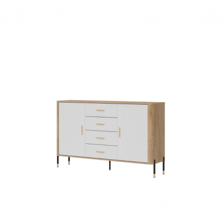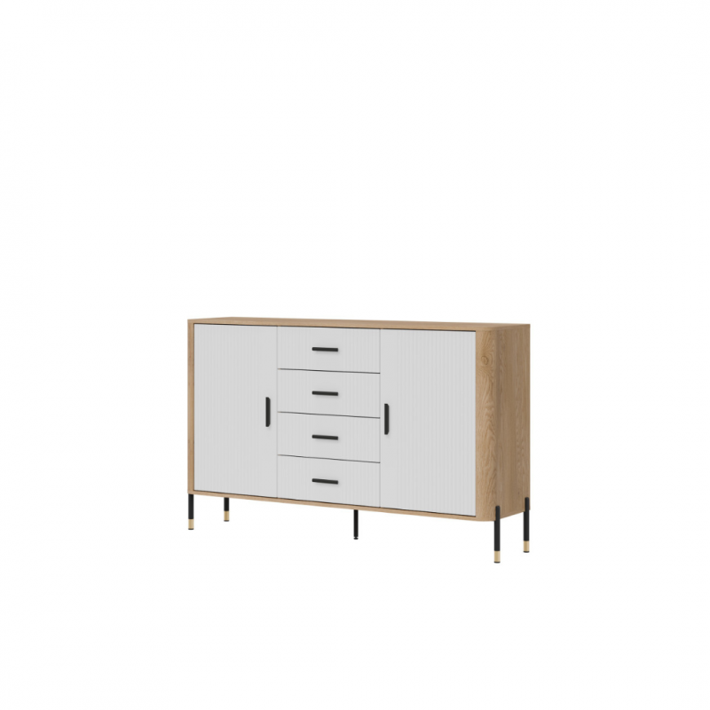 Komoda Dante DT09 – harmonia proporcji, styl i pojemność. Jest to propozycja dla tych, którzy szukają mebla będącego połączeniem elegancji, funkcjonalności i wyjątkowej dbałości o detale. Komoda została zaprojektowana z myślą o nowoczesnych przestrzeniach, w których styl idzie w parze z użytecznością. Mebel oferuje cztery symetrycznie rozmieszczone szuflady w centralnej części, które zapewniają szybki i wygodny dostęp do drobiazgów, odzieży czy dokumentów. Po obu stronach znajdują się zamykane szafki z półkami, idealne do przechowywania większych przedmiotów, takich jak książki, naczynia, kolekcje dekoracji czy akcesoria biurowe. Estetykę komody podkreśla kontrastowy design – matowe, czarne fronty dostępne w pięciu wariantach kolorystycznych zestawione z korpusem w naturalnym odcieniu drewna tworzą wyrafinowaną, a zarazem uniwersalną kompozycję kolorystyczną. do wyboru złote lub czarne uchwyty w minimalistycznym stylu oraz metalowe nogi w czarno-złotym wykończeniu dopełniają całości, dodając meblowi subtelnej elegancji i lekkości. Dante DT09 komoda, która definiuje styl Twojego wnętrza. Niezależnie od tego, czy stawiasz na funkcjonalność, czy design – komody DT09 dostarcza obu tych wartości. To mebel, który nie tylko organizuje przestrzeń, ale również stanowi jej wyjątkową ozdobę.