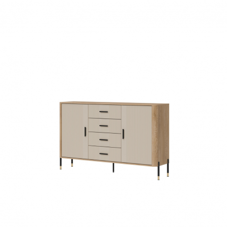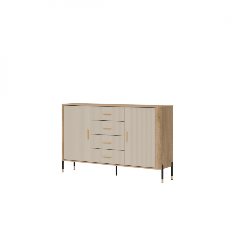 Komoda Dante DT09 – harmonia proporcji, styl i pojemność. Jest to propozycja dla tych, którzy szukają mebla będącego połączeniem elegancji, funkcjonalności i wyjątkowej dbałości o detale. Komoda została zaprojektowana z myślą o nowoczesnych przestrzeniach, w których styl idzie w parze z użytecznością. Mebel oferuje cztery symetrycznie rozmieszczone szuflady w centralnej części, które zapewniają szybki i wygodny dostęp do drobiazgów, odzieży czy dokumentów. Po obu stronach znajdują się zamykane szafki z półkami, idealne do przechowywania większych przedmiotów, takich jak książki, naczynia, kolekcje dekoracji czy akcesoria biurowe. Estetykę komody podkreśla kontrastowy design – matowe, czarne fronty dostępne w pięciu wariantach kolorystycznych zestawione z korpusem w naturalnym odcieniu drewna tworzą wyrafinowaną, a zarazem uniwersalną kompozycję kolorystyczną. do wyboru złote lub czarne uchwyty w minimalistycznym stylu oraz metalowe nogi w czarno-złotym wykończeniu dopełniają całości, dodając meblowi subtelnej elegancji i lekkości. Dante DT09 komoda, która definiuje styl Twojego wnętrza. Niezależnie od tego, czy stawiasz na funkcjonalność, czy design – komody DT09 dostarcza obu tych wartości. To mebel, który nie tylko organizuje przestrzeń, ale również stanowi jej wyjątkową ozdobę.