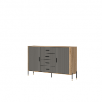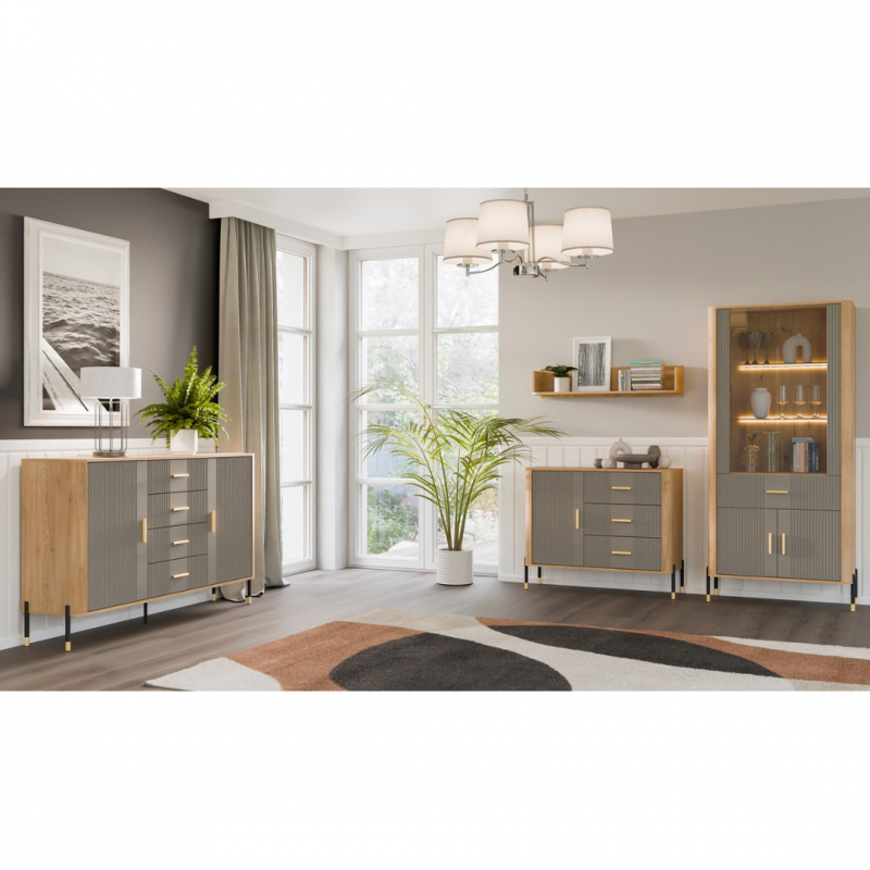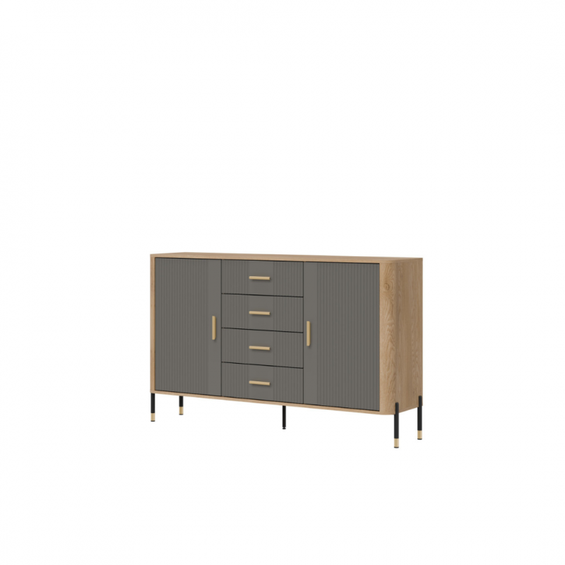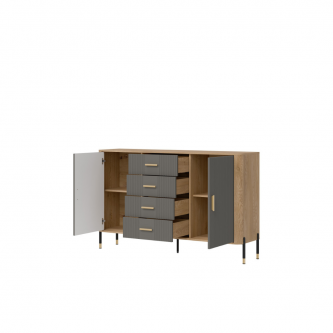 Komoda Dante DT09 – harmonia proporcji, styl i pojemność. Jest to propozycja dla tych, którzy szukają mebla będącego połączeniem elegancji, funkcjonalności i wyjątkowej dbałości o detale. Komoda została zaprojektowana z myślą o nowoczesnych przestrzeniach, w których styl idzie w parze z użytecznością. Mebel oferuje cztery symetrycznie rozmieszczone szuflady w centralnej części, które zapewniają szybki i wygodny dostęp do drobiazgów, odzieży czy dokumentów. Po obu stronach znajdują się zamykane szafki z półkami, idealne do przechowywania większych przedmiotów, takich jak książki, naczynia, kolekcje dekoracji czy akcesoria biurowe. Estetykę komody podkreśla kontrastowy design – matowe, czarne fronty dostępne w pięciu wariantach kolorystycznych zestawione z korpusem w naturalnym odcieniu drewna tworzą wyrafinowaną, a zarazem uniwersalną kompozycję kolorystyczną. do wyboru złote lub czarne uchwyty w minimalistycznym stylu oraz metalowe nogi w czarno-złotym wykończeniu dopełniają całości, dodając meblowi subtelnej elegancji i lekkości. Dante DT09  komoda, która definiuje styl Twojego wnętrza. Niezależnie od tego, czy stawiasz na funkcjonalność, czy design – komody DT09 dostarcza obu tych wartości. To mebel, który nie tylko organizuje przestrzeń, ale również stanowi jej wyjątkową ozdobę.