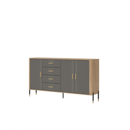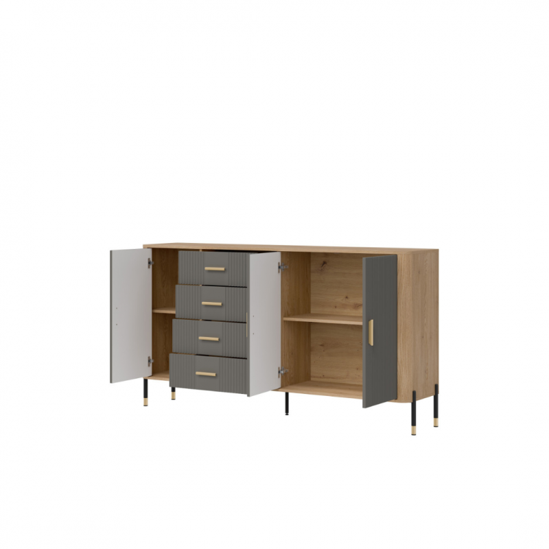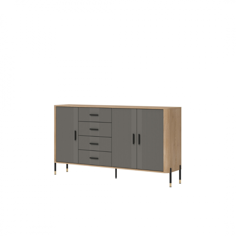 Komoda Dante DT10 – doskonała równowaga między formą a funkcją. Nowoczesna komoda DT10 to idealny wybór dla tych, którzy cenią sobie elegancki design, wysoką jakość wykonania i praktyczne rozwiązania do przechowywania. To najbardziej rozbudowany model komód z kolekcji Dante, który wyróżnia się symetryczną konstrukcją i imponującą pojemnością. Centralną część mebla stanowią cztery szerokie szuflady, które umożliwiają przechowywanie zarówno mniejszych akcesoriów, jak i większych elementów garderoby czy tekstyliów domowych. Po bokach znajdują się trzydrzwiowe szafki – jedna z lewej i dwuskrzydłowa po prawej stronie – wyposażone w praktyczne półki. To idealna przestrzeń na naczynia, książki, segregatory, zapasy czy inne większe przedmioty. Komoda ta zachwyca swoim designem – matowe fronty dostępne w pięciu wariantach kolorystycznych do wyboru w połączeniu z korpusem o naturalnym, dębowym wybarwieniu tworzą elegancką i ponadczasową całość. Złote lub czarne uchwyty do wyboru i metalowe nogi w czarno-złotym wykończeniu podkreślają nowoczesny, loftowy charakter mebla, a dodatkowa środkowa noga zapewnia stabilność i trwałość konstrukcji. Dante DT10 – przestrzeń, styl i wygoda w jednym meblu. To komoda, która nie tylko uporządkuje Twoje wnętrze, ale także stanie się jego wizytówką. Wyjątkowa w formie, wszechstronna w funkcji – Dante DT10 to mebel, który spełni oczekiwania najbardziej wymagających użytkowników.