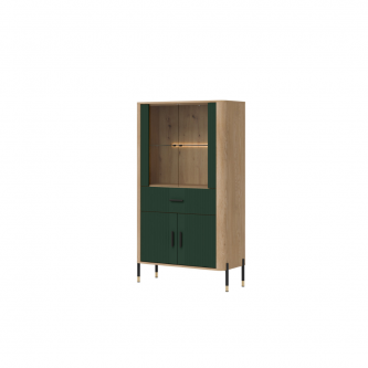 Witryna Dante DT12 – elegancja ekspozycji i funkcjonalność przechowywania. Dante DT12 to połączenie nowoczesnego stylu, funkcjonalności oraz subtelnego wyrafinowania. Ta elegancka witryna została zaprojektowana z myślą o tych, którzy chcą wyeksponować najpiękniejsze elementy swojego wnętrza – porcelanę, szkło, kolekcje czy pamiątki – w oprawie, która sama w sobie stanowi dekorację. Górna część mebla to przeszklona witryna z delikatnym podświetleniem LED dostępnym w opcji, które subtelnie wydobywa i akcentuje umieszczone w środku przedmioty. Tło z naturalnym dekorem drewna nadaje całości ciepłego, przytulnego charakteru i doskonale kontrastuje z matową kolorystyką frontów w pięciu wariantach kolorystycznych do wyboru. To miejsce, które tworzy klimat – zarówno w salonie, jak i w jadalni. Dolna część witryny to praktyczna szuflada oraz pojemna szafka dwudrzwiowa, które zapewniają sporo miejsca do przechowywania przedmiotów codziennego użytku – od obrusów po dokumenty czy zastawę. Złote lub czarne uchwyty oraz czarno-złote, smukłe metalowe nogi dodają lekkości i ekskluzywnego charakteru, sprawiając, że witryna DT12 będzie prawdziwą ozdobą każdego wnętrza. Witryna Dante – wyeksponuj to, co najcenniejsze. Schowaj to, co potrzebne. Wybierz witrynę, która łączy wyrafinowaną estetykę z codzienną funkcjonalnością. Dante DT12 to mebel, który nada przestrzeni charakteru i porządku – niezależnie od stylu Twojego wnętrza.