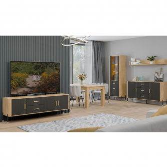 Witryna Dante DT12 – elegancja ekspozycji i funkcjonalność przechowywania. Dante DT12 to połączenie nowoczesnego stylu, funkcjonalności oraz subtelnego wyrafinowania. Ta elegancka witryna została zaprojektowana z myślą o tych, którzy chcą wyeksponować najpiękniejsze elementy swojego wnętrza – porcelanę, szkło, kolekcje czy pamiątki – w oprawie, która sama w sobie stanowi dekorację. Górna część mebla to przeszklona witryna z delikatnym podświetleniem LED dostępnym w opcji, które subtelnie wydobywa i akcentuje umieszczone w środku przedmioty. Tło z naturalnym dekorem drewna nadaje całości ciepłego, przytulnego charakteru i doskonale kontrastuje z matową kolorystyką frontów w pięciu wariantach kolorystycznych do wyboru. To miejsce, które tworzy klimat – zarówno w salonie, jak i w jadalni. Dolna część witryny to praktyczna szuflada oraz pojemna szafka dwudrzwiowa, które zapewniają sporo miejsca do przechowywania przedmiotów codziennego użytku – od obrusów po dokumenty czy zastawę. Złote lub czarne uchwyty oraz czarno-złote, smukłe metalowe nogi dodają lekkości i ekskluzywnego charakteru, sprawiając, że witryna DT12 będzie prawdziwą ozdobą każdego wnętrza. Witryna Dante – wyeksponuj to, co najcenniejsze. Schowaj to, co potrzebne. Wybierz witrynę, która łączy wyrafinowaną estetykę z codzienną funkcjonalnością. Dante DT12 to mebel, który nada przestrzeni charakteru i porządku – niezależnie od stylu Twojego wnętrza.