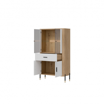 Witryna Dante DT12 – elegancja ekspozycji i funkcjonalność przechowywania. Dante DT12 to połączenie nowoczesnego stylu, funkcjonalności oraz subtelnego wyrafinowania. Ta elegancka witryna została zaprojektowana z myślą o tych, którzy chcą wyeksponować najpiękniejsze elementy swojego wnętrza – porcelanę, szkło, kolekcje czy pamiątki – w oprawie, która sama w sobie stanowi dekorację. Górna część mebla to przeszklona witryna z delikatnym podświetleniem LED dostępnym w opcji, które subtelnie wydobywa i akcentuje umieszczone w środku przedmioty. Tło z naturalnym dekorem drewna nadaje całości ciepłego, przytulnego charakteru i doskonale kontrastuje z matową kolorystyką frontów w pięciu wariantach kolorystycznych do wyboru. To miejsce, które tworzy klimat – zarówno w salonie, jak i w jadalni. Dolna część witryny to praktyczna szuflada oraz pojemna szafka dwudrzwiowa, które zapewniają sporo miejsca do przechowywania przedmiotów codziennego użytku – od obrusów po dokumenty czy zastawę. Złote lub czarne uchwyty oraz czarno-złote, smukłe metalowe nogi dodają lekkości i ekskluzywnego charakteru, sprawiając, że witryna DT12 będzie prawdziwą ozdobą każdego wnętrza. Witryna Dante – wyeksponuj to, co najcenniejsze. Schowaj to, co potrzebne. Wybierz witrynę, która łączy wyrafinowaną estetykę z codzienną funkcjonalnością. Dante DT12 to mebel, który nada przestrzeni charakteru i porządku – niezależnie od stylu Twojego wnętrza.