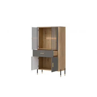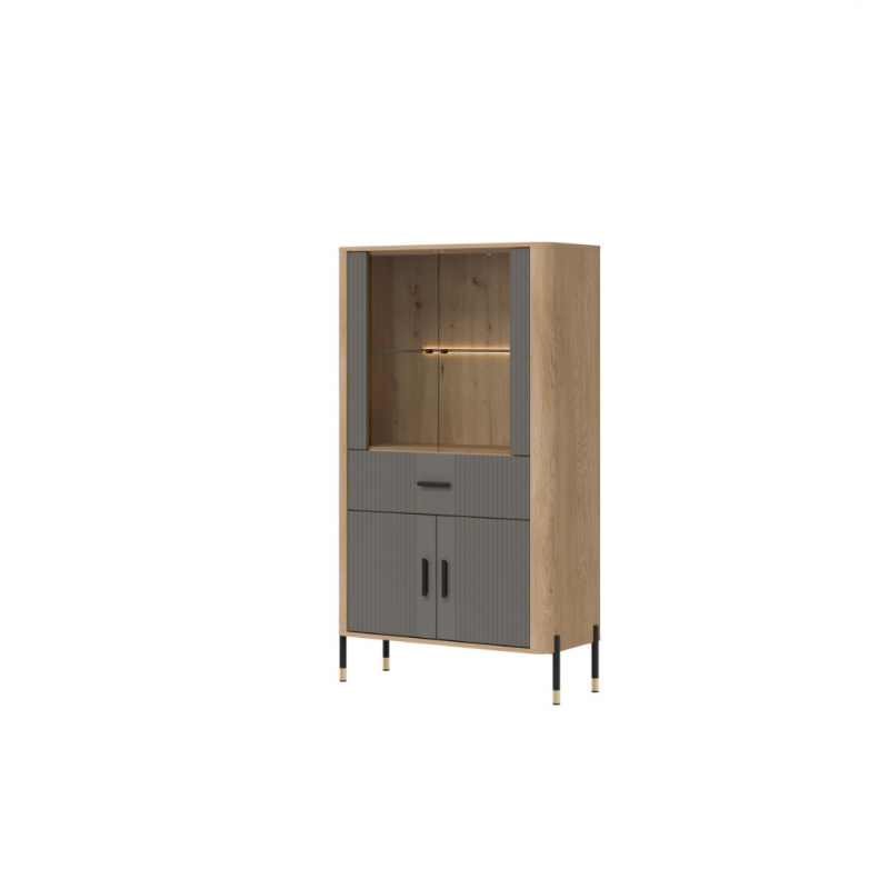 Witryna Dante DT12 – elegancja ekspozycji i funkcjonalność przechowywania. Dante DT12 to połączenie nowoczesnego stylu, funkcjonalności oraz subtelnego wyrafinowania. Ta elegancka witryna została zaprojektowana z myślą o tych, którzy chcą wyeksponować najpiękniejsze elementy swojego wnętrza – porcelanę, szkło, kolekcje czy pamiątki – w oprawie, która sama w sobie stanowi dekorację. Górna część mebla to przeszklona witryna z delikatnym podświetleniem LED dostępnym w opcji, które subtelnie wydobywa i akcentuje umieszczone w środku przedmioty. Tło z naturalnym dekorem drewna nadaje całości ciepłego, przytulnego charakteru i doskonale kontrastuje z matową kolorystyką frontów w pięciu wariantach kolorystycznych do wyboru. To miejsce, które tworzy klimat – zarówno w salonie, jak i w jadalni. Dolna część witryny to praktyczna szuflada oraz pojemna szafka dwudrzwiowa, które zapewniają sporo miejsca do przechowywania przedmiotów codziennego użytku – od obrusów po dokumenty czy zastawę. Złote lub czarne uchwyty oraz czarno-złote, smukłe metalowe nogi dodają lekkości i ekskluzywnego charakteru, sprawiając, że witryna DT12 będzie prawdziwą ozdobą każdego wnętrza. Witryna Dante – wyeksponuj to, co najcenniejsze. Schowaj to, co potrzebne. Wybierz witrynę, która łączy wyrafinowaną estetykę z codzienną funkcjonalnością. Dante DT12 to mebel, który nada przestrzeni charakteru i porządku – niezależnie od stylu Twojego wnętrza.