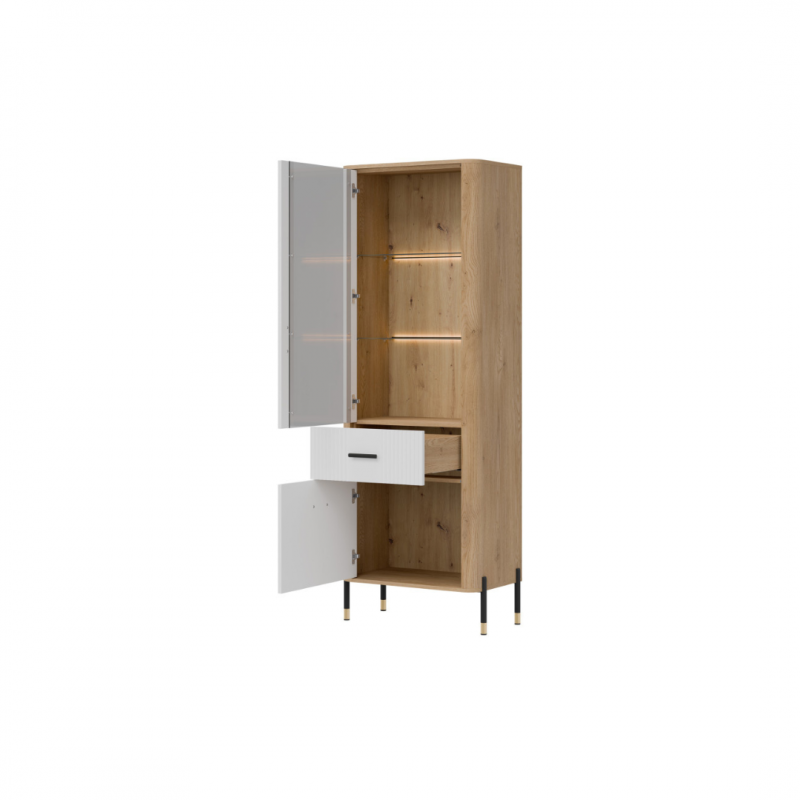 Witryna Dante DT13 – elegancka forma, funkcjonalna treść. Dante DT13 AZ to wyrafinowany mebel, który zachwyca swoją smukłą sylwetką i nowoczesnym charakterem. Idealna do salonu, jadalni czy gabinetu – wszędzie tam, gdzie liczy się estetyka i praktyczne przechowywanie. Jej przemyślana forma sprawia, że świetnie odnajduje się zarówno w przestronnych wnętrzach, jak i w tych bardziej kompaktowych. Główna część witryny to przeszklona, opcjonalnie podświetlana LED-owo przestrzeń ekspozycyjna, która subtelnie eksponuje ulubione dekoracje, książki czy porcelanę. Ciepłe światło w połączeniu z tłem z dekoru drewna tworzy wyjątkowy klimat i nadaje wnętrzu przytulności. Dolna część mebla została zaprojektowana z myślą o codziennych potrzebach – wyposażona w praktyczną szufladę oraz pojemną, zamykaną szafkę, pozwala uporządkować przedmioty, które powinny być zawsze pod ręką, lecz poza wzrokiem. Fronty w eleganckim, matowym wykończeniu w pięciu wariantach kolorystycznych, delikatnie przełamane ciepłym dekorem dębu oraz złote lub czarne detale uchwytów do wyboru i nóg tworzą wyjątkowo stylowe połączenie – nowoczesne, ale z nutą klasyki. Witryna Dante DT13 – styl, który przyciąga wzrok. Funkcja, która porządkuje przestrzeń. Zaproś elegancję do swojego wnętrza z witryną DT13 – meblem, który harmonijnie łączy piękno z codzienną użytecznością.
