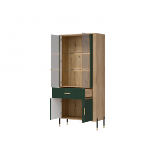 Witryna Dante DT14 przestrzeń ekspozycji w najlepszym stylu. Dante DT14 to doskonałe połączenie elegancji, nowoczesnego designu i funkcjonalności. Zaprojektowana z myślą o wnętrzach, w których liczy się każdy detal, idealnie sprawdzi się w salonie, jadalni czy domowym gabinecie – wszędzie tam, gdzie chcesz połączyć estetykę z praktycznym przechowywaniem. Górna część mebla stanowi przeszkloną witrynę z podświetleniem LED w opcj, która eksponuje to, co najcenniejsze – od rodzinnych pamiątek, przez szkło i ceramikę, po designerskie dodatki. Ciepła barwa światła podkreśla naturalny rysunek drewna i dodaje wnętrzu przytulnego klimatu. W dolnej części mebla znajduje się praktyczna szuflada oraz pojemna szafka z podwójnymi drzwiami, które pomogą utrzymać porządek i ukryć mniej reprezentacyjne przedmioty. Witrynę wyróżnia unikatowe zestawienie kolorystyczne – matowe, fronty dostępne w pięciu wariantach kolorystycznych połączone z dekorem dębu artisan tworzą elegancki, ale i ponadczasowy kontrast. Całości dopełniają do wyboru złote lub czarne uchwyty i detale nóg, które wprowadzają subtelną nutę luksusu. DT14 – witryna, która podkreśli charakter Twojego wnętrza. Pozwól, by estetyka i funkcjonalność spotkały się w jednym meblu – wybierz DT14 AZ i stwórz przestrzeń, która inspiruje każdego dnia.