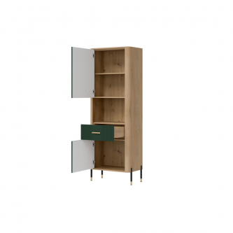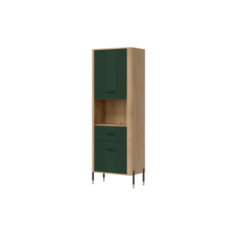 Szafka Dante DT15 – nowoczesna funkcjonalność w eleganckiej oprawie. Dante DT15 to propozycja dla osób, które cenią sobie minimalistyczną elegancję połączoną z maksymalną praktycznością. Ten wysoki, smukły regał doskonale sprawdzi się w salonie, gabinecie, przedpokoju, a nawet w sypialni – wszędzie tam, gdzie potrzebujesz zorganizowanej przestrzeni i stylowego wyglądu. Regał został podzielony na trzy funkcjonalne strefy. Górna i dolna część mebla to zamykane szafki z pełnymi frontami, idealne do przechowywania przedmiotów, które chcesz mieć pod ręką, ale niekoniecznie na widoku. Środkowa, otwarta półka wykończona w dekorze naturalnego dębu świetnie nadaje się do wyeksponowania książek, ramek ze zdjęciami czy dekoracji, nadając wnętrzu indywidualnego charakteru. Matowe fronty w eleganckich pięciu odcieniach kolorystycznych do wyboru kontrastują z ciepłym dekorem drewna, tworząc nowoczesny i zarazem przytulny efekt. Całości dopełniają subtelne złote lub czarne uchwyty do wyboru i smukłe nóżki z metalicznymi akcentami, które dodają meblowi lekkości oraz stylowego wykończenia. Szafka DT15 – design, który porządkuje przestrzeń i przyciąga spojrzenia. Ten model to idealny wybór dla tych, którzy szukają stylowych i praktycznych rozwiązań meblowych. Wprowadź do swojego wnętrza funkcjonalność w eleganckiej formie.