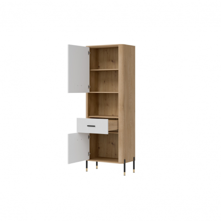 Szafka Dante DT15 – nowoczesna funkcjonalność w eleganckiej oprawie. Dante DT15 to propozycja dla osób, które cenią sobie minimalistyczną elegancję połączoną z maksymalną praktycznością. Ten wysoki, smukły regał doskonale sprawdzi się w salonie, gabinecie, przedpokoju, a nawet w sypialni – wszędzie tam, gdzie potrzebujesz zorganizowanej przestrzeni i stylowego wyglądu. Regał został podzielony na trzy funkcjonalne strefy. Górna i dolna część mebla to zamykane szafki z pełnymi frontami, idealne do przechowywania przedmiotów, które chcesz mieć pod ręką, ale niekoniecznie na widoku. Środkowa, otwarta półka wykończona w dekorze naturalnego dębu świetnie nadaje się do wyeksponowania książek, ramek ze zdjęciami czy dekoracji, nadając wnętrzu indywidualnego charakteru. Matowe fronty w eleganckich pięciu odcieniach kolorystycznych do wyboru kontrastują z ciepłym dekorem drewna, tworząc nowoczesny i zarazem przytulny efekt. Całości dopełniają subtelne złote lub czarne uchwyty do wyboru i smukłe nóżki z metalicznymi akcentami, które dodają meblowi lekkości oraz stylowego wykończenia. Szafka DT15 – design, który porządkuje przestrzeń i przyciąga spojrzenia. Ten model to idealny wybór dla tych, którzy szukają stylowych i praktycznych rozwiązań meblowych. Wprowadź do swojego wnętrza funkcjonalność w eleganckiej formie.