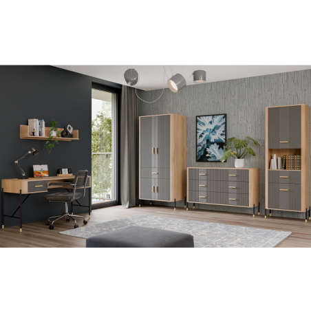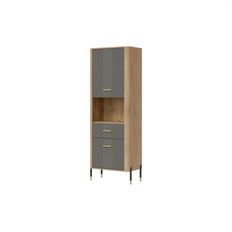 Szafka Dante DT15 – nowoczesna funkcjonalność w eleganckiej oprawie. Dante DT15 to propozycja dla osób, które cenią sobie minimalistyczną elegancję połączoną z maksymalną praktycznością. Ten wysoki, smukły regał doskonale sprawdzi się w salonie, gabinecie, przedpokoju, a nawet w sypialni – wszędzie tam, gdzie potrzebujesz zorganizowanej przestrzeni i stylowego wyglądu. Regał został podzielony na trzy funkcjonalne strefy. Górna i dolna część mebla to zamykane szafki z pełnymi frontami, idealne do przechowywania przedmiotów, które chcesz mieć pod ręką, ale niekoniecznie na widoku. Środkowa, otwarta półka wykończona w dekorze naturalnego dębu świetnie nadaje się do wyeksponowania książek, ramek ze zdjęciami czy dekoracji, nadając wnętrzu indywidualnego charakteru. Matowe fronty w eleganckich pięciu odcieniach kolorystycznych do wyboru kontrastują z ciepłym dekorem drewna, tworząc nowoczesny i zarazem przytulny efekt. Całości dopełniają subtelne złote lub czarne uchwyty do wyboru i smukłe nóżki z metalicznymi akcentami, które dodają meblowi lekkości oraz stylowego wykończenia. Szafka DT15 – design, który porządkuje przestrzeń i przyciąga spojrzenia. Ten model to idealny wybór dla tych, którzy szukają stylowych i praktycznych rozwiązań meblowych. Wprowadź do swojego wnętrza funkcjonalność w eleganckiej formie.