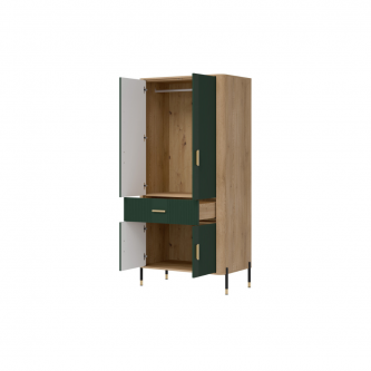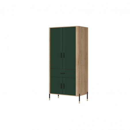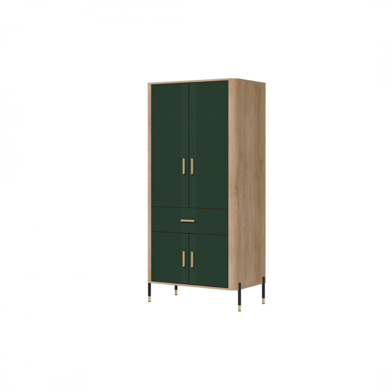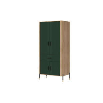 Szafa 2D Dante DT16 – maksymalna pojemność w eleganckim wydaniu. Dante DT16 to szafa, która doskonale łączy w sobie elegancki design z wyjątkową funkcjonalnością. Jej nowoczesna forma i przemyślana konstrukcja sprawiają, że stanowi ona doskonały wybór do salonu, jadalni, przedpokoju, a nawet biura – wszędzie tam, gdzie potrzebujesz estetycznego i pojemnego miejsca do przechowywania. Fronty mebla w w pięciu matowych wariantach kolorystycznych do wyboru, nadają mu szlachetności i nowoczesnego charakteru, podczas gdy korpus w dekorze naturalnego dębu ociepla całość, wprowadzając przytulność i styl. Mebel został wyposażony w cztery zamykane strefy – górne i dolne szafki z podwójnymi drzwiami oraz centralną szufladę, która ułatwia organizację drobnych przedmiotów. Solidna, smukła bryła szafy osadzona została na lekkich, metalowych nóżkach z eleganckimi złotymi zakończeniami, co nadaje konstrukcji lekkości i pozwala łatwo utrzymać czystość pod meblem. Całości dopełniają złote lub czarne, pionowe uchwyty, które są zarówno ozdobne, jak i ergonomiczne. Dante DT16 – styl i pojemność w jednym. Ten model to perfekcyjne rozwiązanie dla tych, którzy szukają nowoczesnego, a jednocześnie praktycznego mebla o ponadczasowym charakterze. Nadaj wnętrzu klasy i funkcjonalności dzięki szafie 2D Dante.