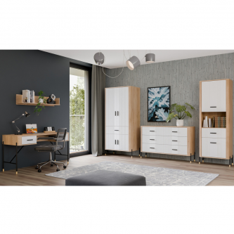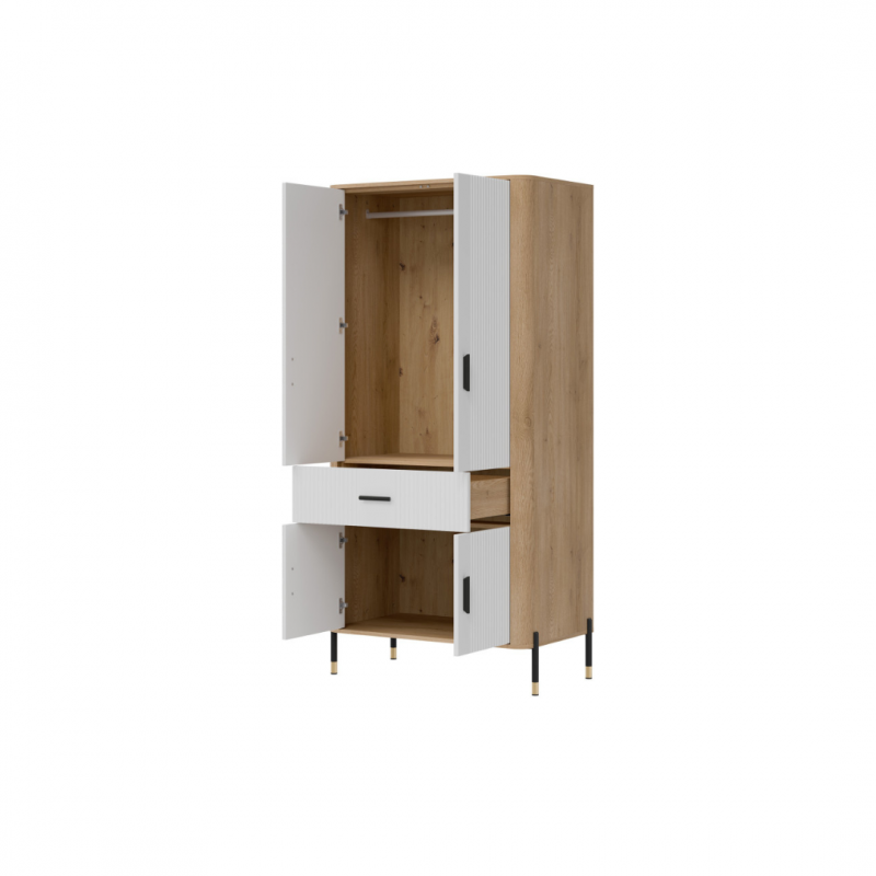 Szafa 2D Dante DT16 – maksymalna pojemność w eleganckim wydaniu. Dante DT16 to szafa, która doskonale łączy w sobie elegancki design z wyjątkową funkcjonalnością. Jej nowoczesna forma i przemyślana konstrukcja sprawiają, że stanowi ona doskonały wybór do salonu, jadalni, przedpokoju, a nawet biura – wszędzie tam, gdzie potrzebujesz estetycznego i pojemnego miejsca do przechowywania. Fronty mebla w w pięciu matowych wariantach kolorystycznych do wyboru, nadają mu szlachetności i nowoczesnego charakteru, podczas gdy korpus w dekorze naturalnego dębu ociepla całość, wprowadzając przytulność i styl. Mebel został wyposażony w cztery zamykane strefy – górne i dolne szafki z podwójnymi drzwiami oraz centralną szufladę, która ułatwia organizację drobnych przedmiotów. Solidna, smukła bryła szafy osadzona została na lekkich, metalowych nóżkach z eleganckimi złotymi zakończeniami, co nadaje konstrukcji lekkości i pozwala łatwo utrzymać czystość pod meblem. Całości dopełniają złote lub czarne, pionowe uchwyty, które są zarówno ozdobne, jak i ergonomiczne. Dante DT16 – styl i pojemność w jednym. Ten model to perfekcyjne rozwiązanie dla tych, którzy szukają nowoczesnego, a jednocześnie praktycznego mebla o ponadczasowym charakterze. Nadaj wnętrzu klasy i funkcjonalności dzięki szafie 2D Dante.