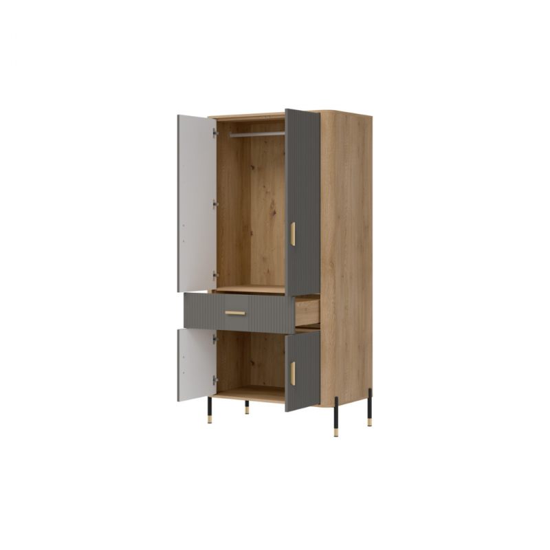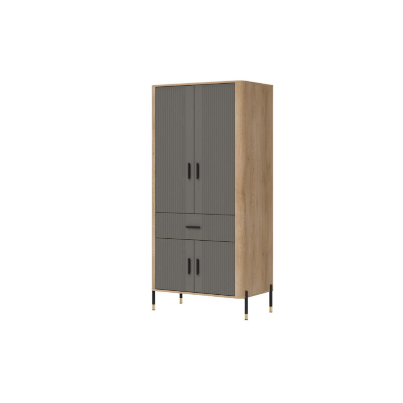 Szafa 2D Dante DT16 – maksymalna pojemność w eleganckim wydaniu. Dante DT16  to szafa, która doskonale łączy w sobie elegancki design z wyjątkową funkcjonalnością. Jej nowoczesna forma i przemyślana konstrukcja sprawiają, że stanowi ona doskonały wybór do salonu, jadalni, przedpokoju, a nawet biura – wszędzie tam, gdzie potrzebujesz estetycznego i pojemnego miejsca do przechowywania. Fronty mebla w w pięciu matowych wariantach kolorystycznych do wyboru, nadają mu szlachetności i nowoczesnego charakteru, podczas gdy korpus w dekorze naturalnego dębu ociepla całość, wprowadzając przytulność i styl. Mebel został wyposażony w cztery zamykane strefy – górne i dolne szafki z podwójnymi drzwiami oraz centralną szufladę, która ułatwia organizację drobnych przedmiotów. Solidna, smukła bryła szafy osadzona została na lekkich, metalowych nóżkach z eleganckimi złotymi zakończeniami, co nadaje konstrukcji lekkości i pozwala łatwo utrzymać czystość pod meblem. Całości dopełniają złote lub czarne, pionowe uchwyty, które są zarówno ozdobne, jak i ergonomiczne. Dante DT16 – styl i pojemność w jednym. Ten model to perfekcyjne rozwiązanie dla tych, którzy szukają nowoczesnego, a jednocześnie praktycznego mebla o ponadczasowym charakterze. Nadaj wnętrzu klasy i funkcjonalności dzięki szafie 2D Dante.