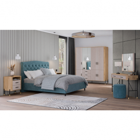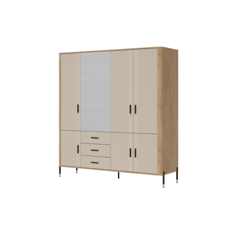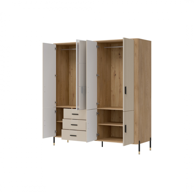 Szafa 7D DT17 – imponująca forma, ponadczasowy styl. Dante DT17 to mebel, który nie tylko przyciąga wzrok eleganckim designem, ale także imponuje swoją funkcjonalnością. Ta przestronna szafa to idealna propozycja dla osób ceniących wysoką jakość wykonania, przemyślaną organizację przestrzeni oraz nowoczesne wzornictwo. Centralną część bryły zajmuje czworo dużych drzwi, które dają doskonały dostęp do praktycznych i pojemnych wnętrz. Drzwi z dużym lustrem nadają meblowi lekkości i elegancji. W dolnej części mebla znajdują się cztery praktyczne szuflady, które ułatwiają organizację drobnych akcesoriów. Mebel utrzymany jest w modnej kolorystyce: połączenie matu w pięciu odcieniach kolorystycznych do wyboru z dekorem drewna dębowego tworzy harmonijny i luksusowy kontrast. Całość wieńczą złote lub czarne, smukłe uchwyty i metalowe nóżki, które podkreślają nowoczesny, ale ciepły charakter mebla. Szafa Dante 7D – centrum stylu i funkcjonalności w Twoim wnętrzu. Ten model to znakomity wybór do salonu, jadalni lub gabinetu – tam, gdzie liczy się estetyka i perfekcyjna organizacja. Szafa DT17, który stworzy przestrzeń pełną charakteru.