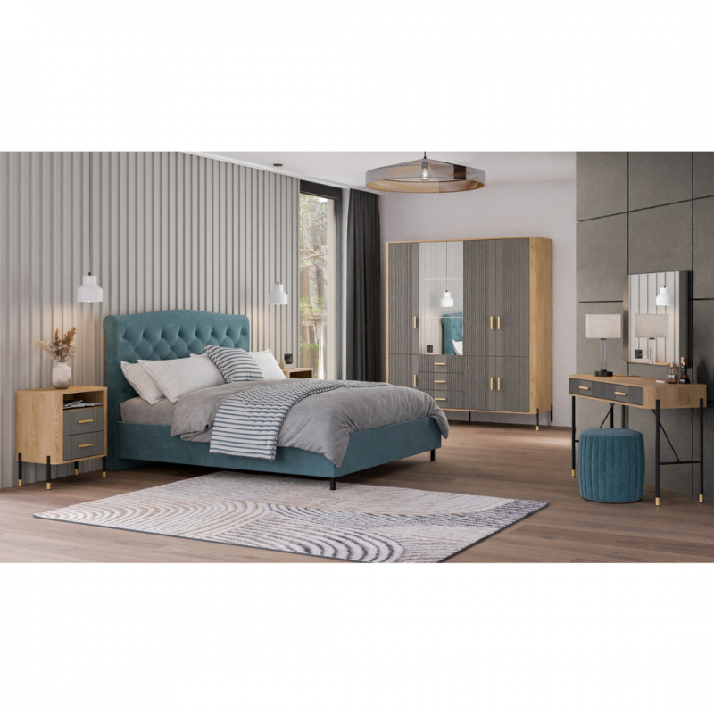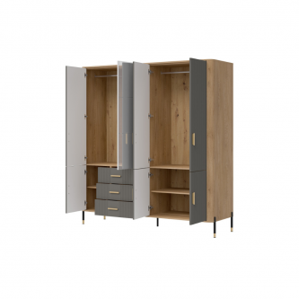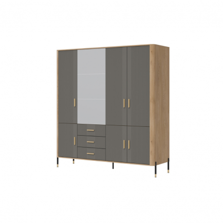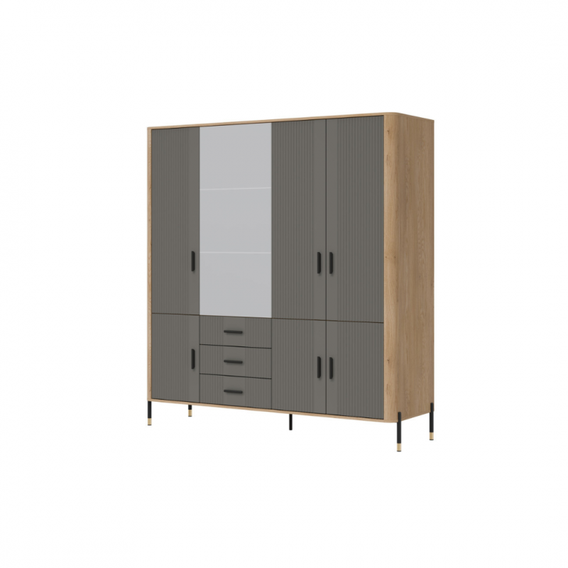 Szafa 7D DT17 – imponująca forma, ponadczasowy styl. Dante DT17 to mebel, który nie tylko przyciąga wzrok eleganckim designem, ale także imponuje swoją funkcjonalnością. Ta przestronna szafa to idealna propozycja dla osób ceniących wysoką jakość wykonania, przemyślaną organizację przestrzeni oraz nowoczesne wzornictwo. Centralną część bryły zajmuje czworo dużych drzwi, które dają doskonały dostęp do praktycznych i pojemnych wnętrz. Drzwi z dużym lustrem nadają meblowi lekkości i elegancji. W dolnej części mebla znajdują się cztery praktyczne szuflady, które ułatwiają organizację drobnych akcesoriów. Mebel utrzymany jest w modnej kolorystyce: połączenie matu w pięciu odcieniach kolorystycznych do wyboru z dekorem drewna dębowego tworzy harmonijny i luksusowy kontrast. Całość wieńczą złote lub czarne, smukłe uchwyty i metalowe nóżki, które podkreślają nowoczesny, ale ciepły charakter mebla. Szafa Dante 7D – centrum stylu i funkcjonalności w Twoim wnętrzu. Ten model to znakomity wybór do salonu, jadalni lub gabinetu – tam, gdzie liczy się estetyka i perfekcyjna organizacja. Szafa DT17, który stworzy przestrzeń pełną charakteru.