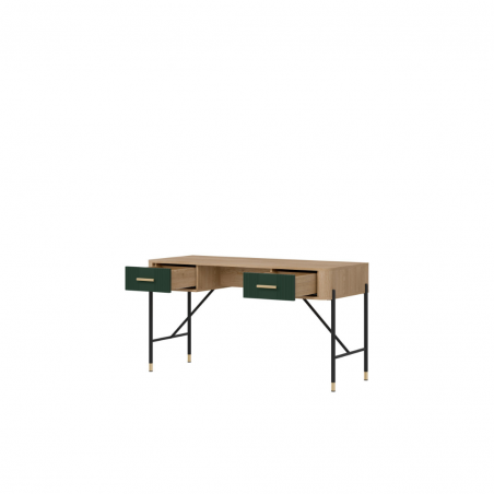 Biurko Dante DT23 – styl i funkcjonalność w nowoczesnej formie. Biurko Dante to perfekcyjne połączenie wyrafinowanego designu z funkcjonalnym podejściem do przestrzeni roboczej. Stworzone z myślą o nowoczesnych wnętrzach, doskonale sprawdzi się zarówno w eleganckim biurze, domowym gabinecie, jak i stylowej przestrzeni do nauki. Jego charakterystyczna forma, z ciepłym dekorem drewna i frontami w pięciu odcieniach kolorystycznych, wzbogacona została o złote lub czarne uchwyty do wyboru i smukłe metalowe nogi, co czyni ten mebel wyjątkowo estetycznym i uniwersalnym elementem aranżacyjnym. Biurko nie tylko zachwyca wyglądem, ale także funkcjonalnością – zostało wyposażone w dwie praktyczne szuflady oraz otwartą wnękę, idealną na drobne akcesoria, notatki lub laptopa. Metalowe nogi z dekoracyjnym złotym zakończeniem zapewniają stabilność oraz nadają całej konstrukcji wizualnej lekkości. Dzięki temu mebel doskonale komponuje się zarówno z loftowym wystrojem, jak i eleganckim wnętrzem o minimalistycznym charakterze. Kolorystyka: Dąb / Czarny mat / Złote akcenty. Dante DT23 – biurko, które inspiruje do działania. To więcej niż tylko miejsce pracy. To mebel, który łączy styl z wygodą, tworząc idealne warunki do nauki, pracy czy twórczych pasji. Biurko DT23 to niezawodny towarzysz codziennych wyzwań, który dodatkowo podkreśli charakter Twojego wnętrza.