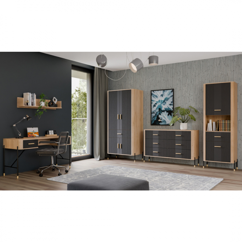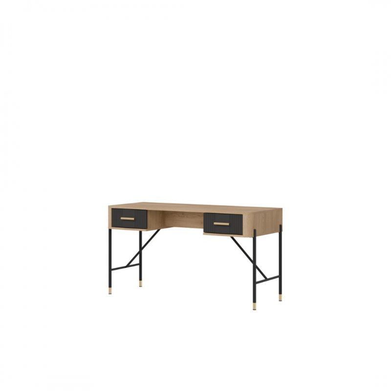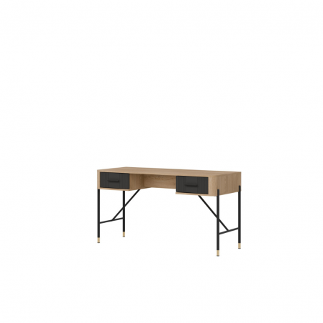 Biurko Dante DT23 – styl i funkcjonalność w nowoczesnej formie. Biurko Dante to perfekcyjne połączenie wyrafinowanego designu z funkcjonalnym podejściem do przestrzeni roboczej. Stworzone z myślą o nowoczesnych wnętrzach, doskonale sprawdzi się zarówno w eleganckim biurze, domowym gabinecie, jak i stylowej przestrzeni do nauki. Jego charakterystyczna forma, z ciepłym dekorem drewna i frontami w pięciu odcieniach kolorystycznych, wzbogacona została o złote lub czarne uchwyty do wyboru i smukłe metalowe nogi, co czyni ten mebel wyjątkowo estetycznym i uniwersalnym elementem aranżacyjnym. Biurko nie tylko zachwyca wyglądem, ale także funkcjonalnością – zostało wyposażone w dwie praktyczne szuflady oraz otwartą wnękę, idealną na drobne akcesoria, notatki lub laptopa. Metalowe nogi z dekoracyjnym złotym zakończeniem zapewniają stabilność oraz nadają całej konstrukcji wizualnej lekkości. Dzięki temu mebel doskonale komponuje się zarówno z loftowym wystrojem, jak i eleganckim wnętrzem o minimalistycznym charakterze. Kolorystyka: Dąb / Czarny mat / Złote akcenty. Dante DT23 – biurko, które inspiruje do działania. To więcej niż tylko miejsce pracy. To mebel, który łączy styl z wygodą, tworząc idealne warunki do nauki, pracy czy twórczych pasji. Biurko DT23 to niezawodny towarzysz codziennych wyzwań, który dodatkowo podkreśli charakter Twojego wnętrza.