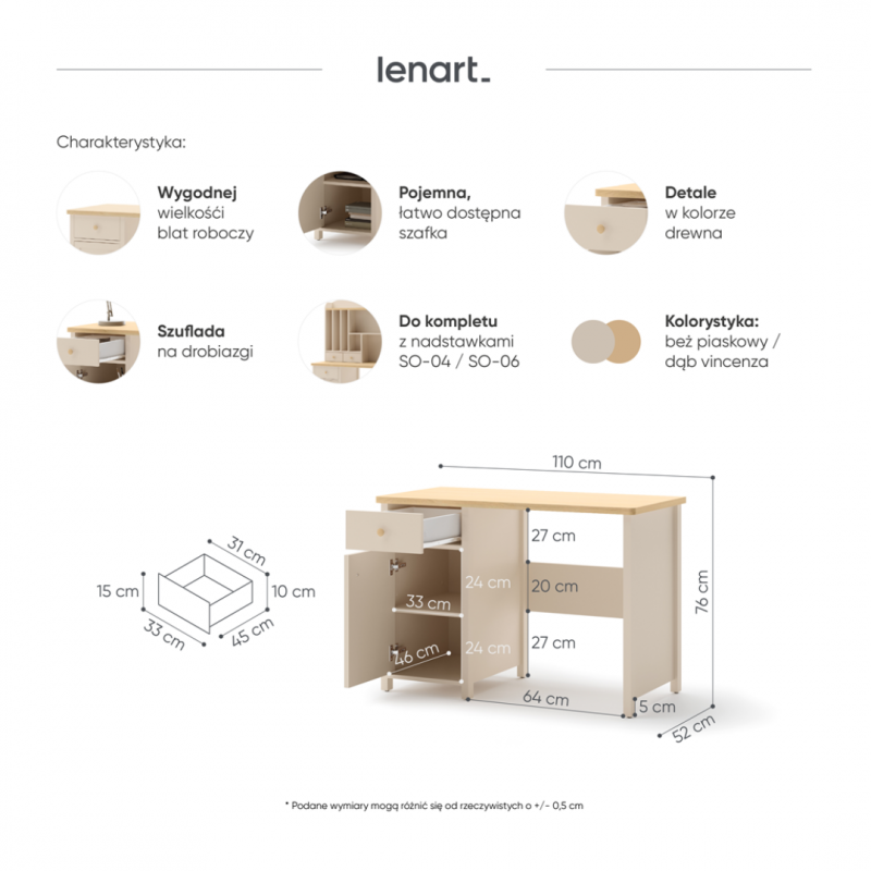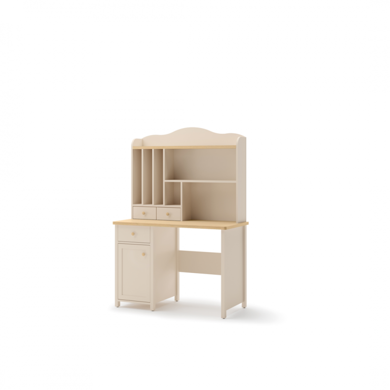 Ergonomiczny blat roboczy zapewnia dużo miejsca do nauki, rysowania i innych prac plastycznych. Pod blatem znajduje się szafka z drzwiami i podręczną szufladą na drobiazgi.