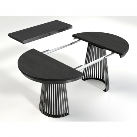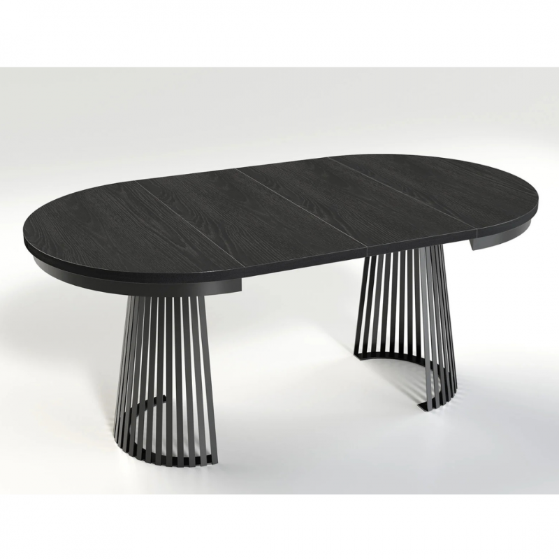 Podstawa stołu wykonana jest z metalu – stabilna i nowoczesna w formie, przyciąga wzrok i dodaje wnętrzu charakteru. Jej rzeźbiarska konstrukcja przypomina wachlarz lub rozłożystą formę geometryczną, co nadaje stołowi lekkości mimo jego solidnej budowy.