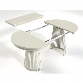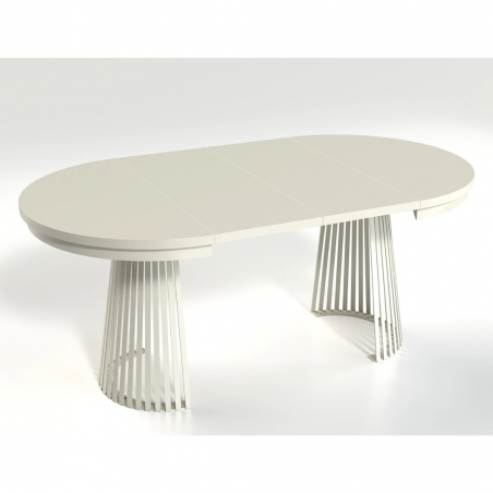 Podstawa stołu wykonana jest z metalu – stabilna i nowoczesna w formie, przyciąga wzrok i dodaje wnętrzu charakteru. Jej rzeźbiarska konstrukcja przypomina wachlarz lub rozłożystą formę geometryczną, co nadaje stołowi lekkości mimo jego solidnej budowy.