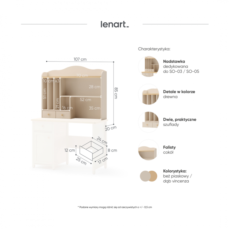Nadstawka wyposażona jest w dwie małe szufladki na przybory szkolne lub inne akcesoria.