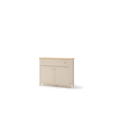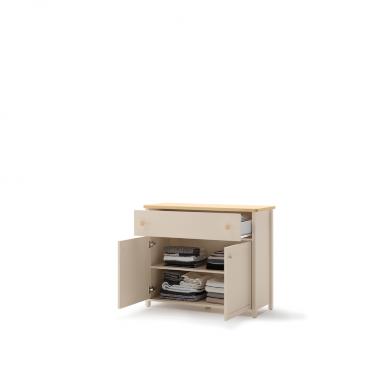 Stylowa komoda z dwojgiem drzwi oraz pojemną i łatwo dostępną szufladą na bieliznę lub drobiazgi.