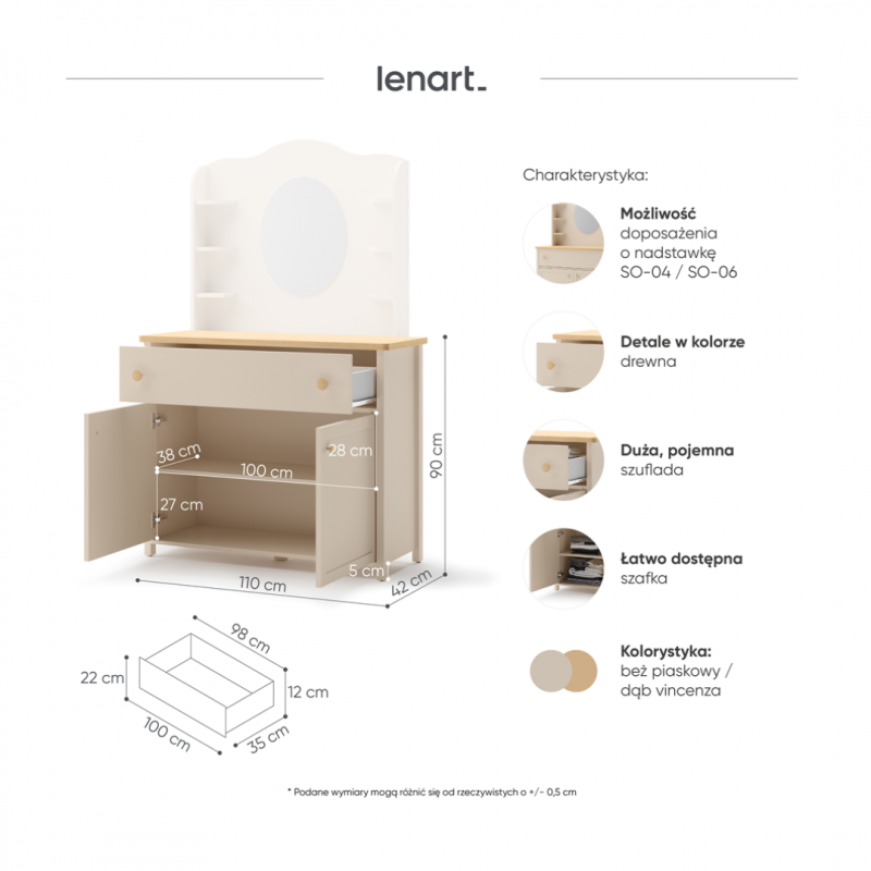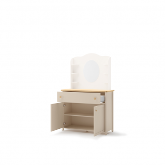 Komodę można skompletować z nadstawką w formie toaletki SO-06 z lustrem i półkami.