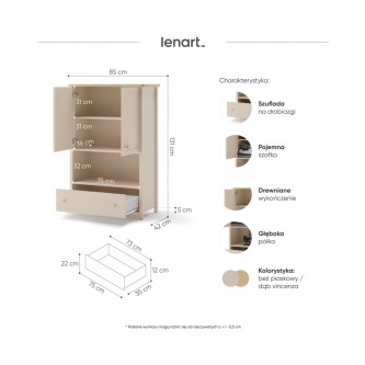 Mebel wyróżnia się oryginalnym charakterem. Bryła w kolorze beżowym oraz blat i dodatki o barwie jasnego drewna tworzą niepowtarzalny styl, który spodoba się wielbicielkom wnętrz w klasycznym stylu.