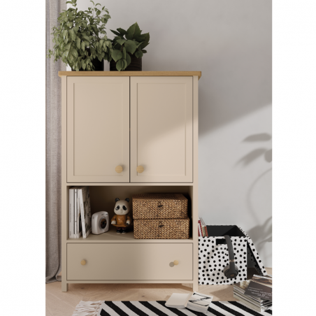 Stylowa, wysoka komoda z dwojgiem drzwi, półką na książki lub dekoracje oraz pojemną i łatwo dostępną szufladą na bieliznę lub drobiazgi.