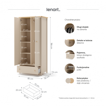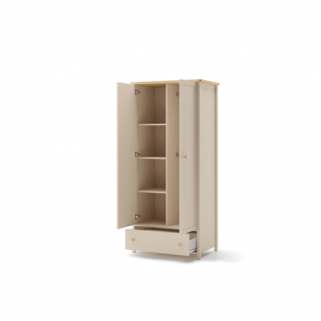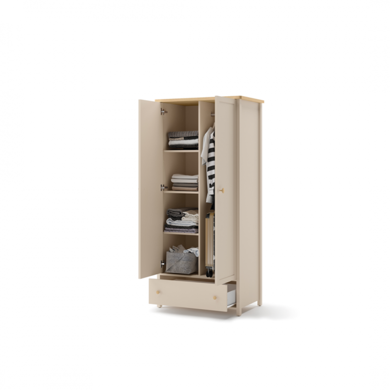 Dwudrzwiowa szafa na ubrania z dwoma drążkami, regałem z półkami i pojemną szufladą. Dzięki takiej konstrukcji maksymalnie wykorzystujemy wnętrze szafy. Możemy w niej zawiesić ubrania różnej długości oraz przechować złożone tekstylia. Mebel wykonano z wytrzymałej płyty laminowanej wykończonej trwałym obrzeżem ABS. Uchwyty z tworzywa.