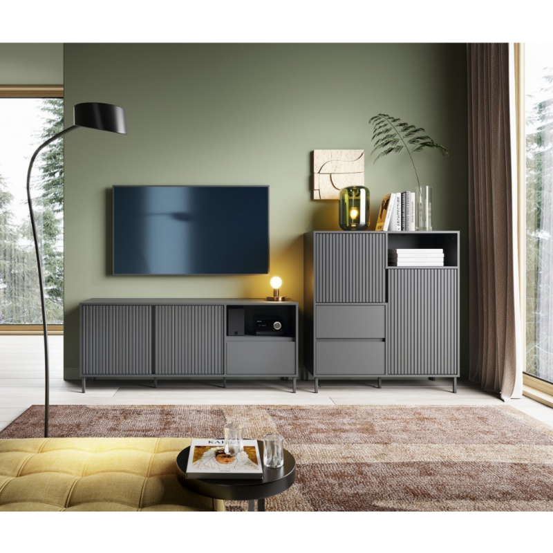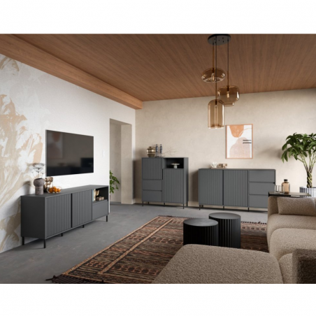 Odkryj nowoczesność i funkcjonalność, które łączą się w jednym meblu – komodzie AVENALE (model AVEK01), która stanie się nie tylko praktycznym elementem Twojego wnętrza, ale również stylową ozdobą. Ta elegancka komoda w odcieniu antracytowym, przyciąga uwagę swoim nowoczesnym designem, idealnie wpisując się w nowoczesne trendy aranżacyjne.