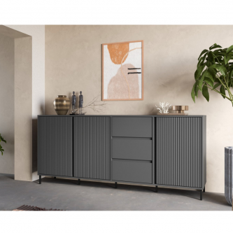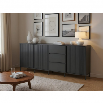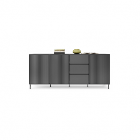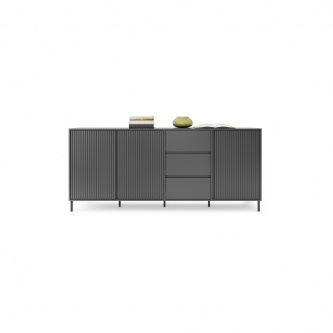Komoda AVENALE AVEK02 w dekorze antracyt supermat przyciąga uwagę minimalistyczną linią i rytmicznym frezowaniem frontów, które dodaje elegancji każdemu nowoczesnemu wnętrzu. Smukłe, metalowe nóżki nadają bryle lekkości, a 12-centymetrowy prześwit ułatwia sprzątanie robotem – wygodne rozwiązanie docenią zarówno lokatorzy małych mieszkań, jak i rodziny poszukujące praktycznych mebli do strefy dziennej. Dzięki szerokości 212 cm komoda pomieści wszystko, co chcesz mieć pod ręką, a jednocześnie nie przytłoczy aranżacji nawet w ograniczonej przestrzeni.