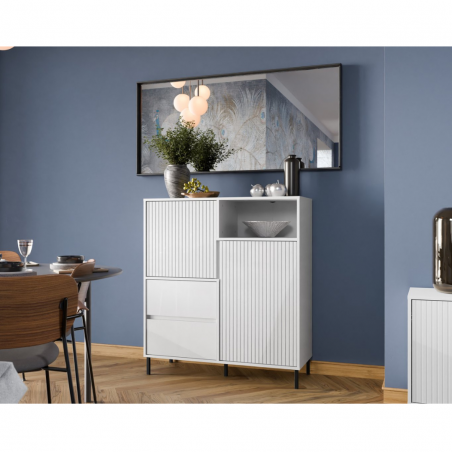 Komoda AVENALE AVEK03 w wersji białej to funkcjonalny mebel o wyrazistym, nowoczesnym charakterze. Połączenie prostych linii z dekoracyjnym ryflowaniem frontów oraz subtelnym połyskiem nadaje bryle elegancki wygląd, który doskonale wpisuje się w aktualne trendy aranżacyjne. Kompaktowy rozmiar (105,4 cm szerokości i 117,2 cm wysokości) oraz lekka forma oparta na czarnych, metalowych nóżkach czynią z niej uniwersalne rozwiązanie do wnętrz o mniejszym metrażu – zarówno do salonu, pokoju młodzieżowego, jak i domowego biura czy jadalni. Nóżki nie tylko podkreślają nowoczesny charakter mebla, ale również umożliwiają swobodne poruszanie się robota sprzątającego pod jego konstrukcją (wysokość dla robota sprzątającego-12 cm). To praktyczne rozwiązanie, które ułatwia utrzymanie porządku bez przesuwania mebla.