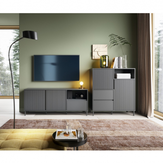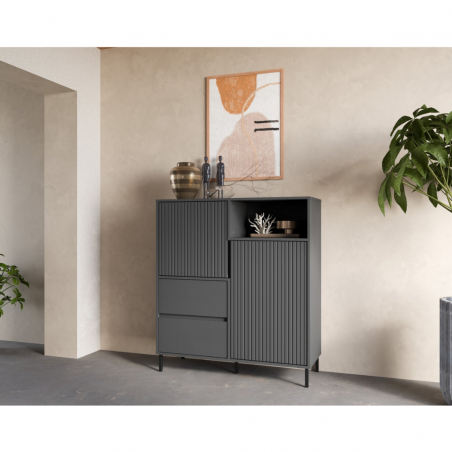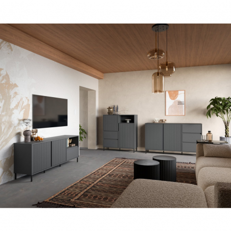 Nowoczesna komoda AVENALE AVEK03 to propozycja dla osób poszukujących niebanalnego designu i funkcjonalności w jednym. Wykończona w dekorze antracyt supermat, przyciąga wzrok minimalistyczną formą i dekoracyjnym ryflowaniem frontów. Smukła bryła oparta na czarnych, metalowych nóżkach nadaje meblowi lekkości, a staranne wykończenie podkreśla elegancki charakter całej kolekcji. Nóżki nie tylko podkreślają nowoczesny charakter mebla, ale również umożliwiają swobodne poruszanie się robota sprzątającego pod jego konstrukcją (wysokość dla robota sprzątającego-12 cm). To praktyczne rozwiązanie, które ułatwia utrzymanie porządku bez przesuwania mebla. Komoda z powodzeniem wpisuje się zarówno w aranżacje nowoczesne, jak i loftowe czy industrialne. Dzięki kompaktowym wymiarom (105,4 cm szerokości i 117,2 cm wysokości) idealnie sprawdzi się w mniejszych przestrzeniach – od salonu, przez sypialnię, po gabinet czy pokój młodzieżowy.