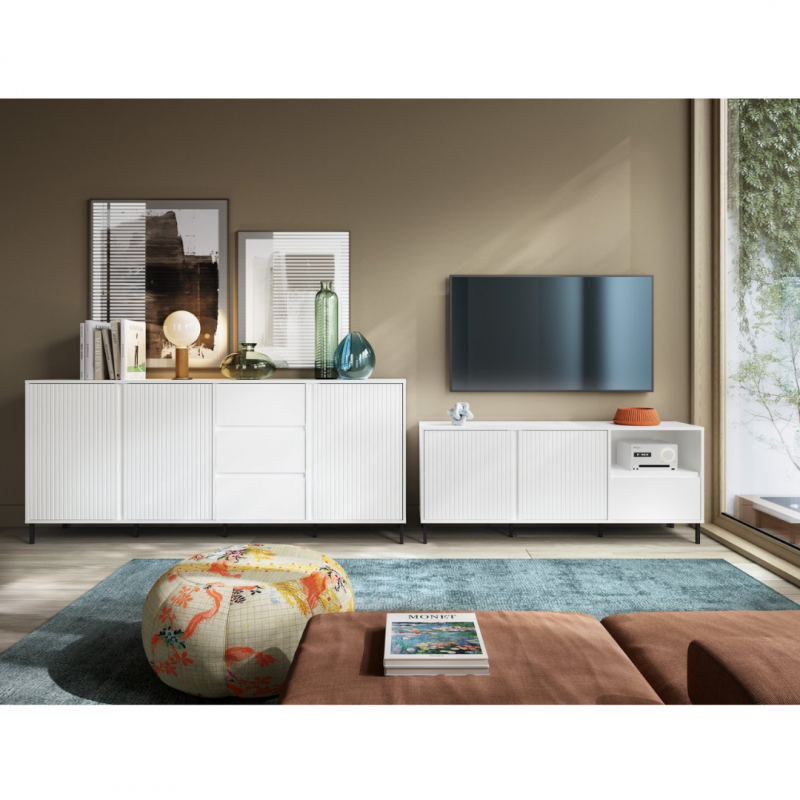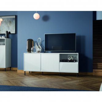 Szafka o wymiarach 157,8 × 65,4 × 40 cm została zbudowana z laminowanej płyty wiórowej (korpus) i płyty MDF (fronty). Po lewej stronie znajdują się drzwi z cichym domykiem; za nimi dwie półki, które pomieszczą sprzęt audio albo kolekcję albumów. Prawą stronę mebla tworzy otwarta wnęka z przepustem kablowym – idealna na dekoder lub konsolę – oraz głęboka szuflada na kulkowych prowadnicach pełnego wysuwu. Wybranie we frontach zastępuje tradycyjne uchwyty, a 12-centymetrowy prześwit pod bryłą ułatwia pracę robota sprzątającego.