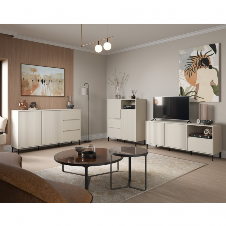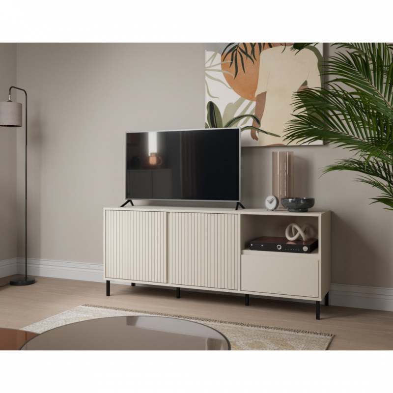 Szafka RTV AVENALE AVEF01 w dekorze kaszmir to jedna z pięciu komód w tej serii. Wszystkie bryły łączy minimalistyczne wzornictwo z pionowymi frezami i czarnymi, metalowymi nogami, a różne szerokości i wysokości pozwalają zbudować spójny układ pod telewizor i przechowywanie. Ciepły odcień kaszmiru ociepla wnętrze i tworzy przyjemne tło dla domowej strefy relaksu.