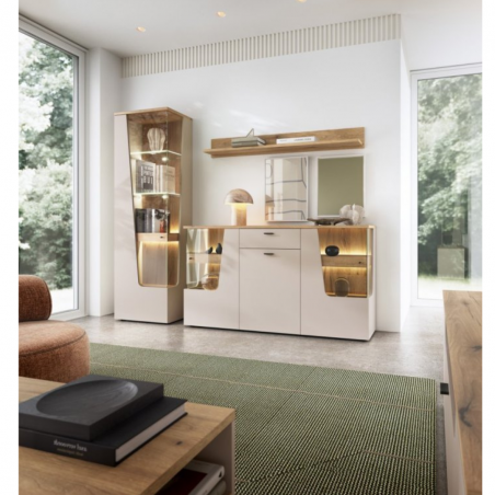 Połączenie kolorystyczne dekorów kaszmir z dębem coast evoke tworzą eleganckie, ale ciepłe zestawienie. Charakterystyczne cięcie frontu i przeszklenie z hartowanego szkła o grubości 4 mm nadają meblowi lekkości i przyciągają wzrok – szczególnie w połączeniu z oświetleniem LED.