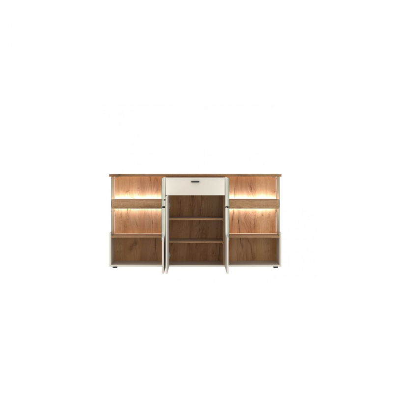 Model wyposażono w trzy uchylne drzwi z systemem cichego domykania oraz praktyczną szufladę, również z funkcją soft-close, idealną do przechowywania drobnych akcesoriów. Wnętrze komody oferuje przestronne półki, które ułatwiają organizację domowych przedmiotów.