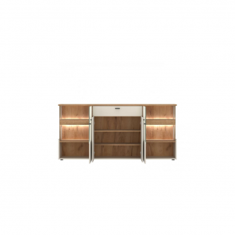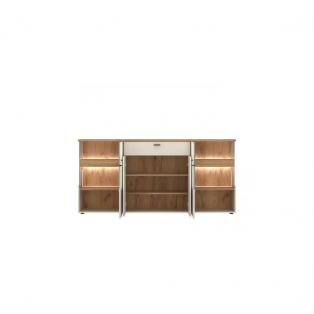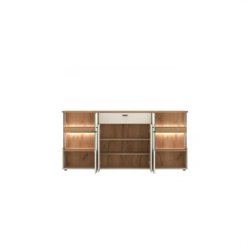 Zastosowane prowadnice i zawiasy z systemem cichego domyku zwiększają komfort użytkowania. Matowe, czarne uchwyty oraz eleganckie, czarne stopki podkreślają nowoczesny charakter mebla i zapewniają jego stabilność. W zestawie znajduje się dwupunktowe oświetlenie GAMA w neutralnym, białym odcieniu, które pięknie podkreśla strukturę drewna i wnętrze witryn. Światło nie tylko wydobywa walory dekoracyjne komody, ale też zwiększa funkcjonalność – zwłaszcza wieczorem.